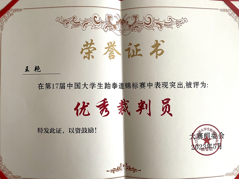 yl9193永利集团跆拳道国家级裁判员王艳老师选派参加了本次比赛的执裁工作,在比赛执裁工作中,王艳老师严格遵守裁判员准则,以“严肃、认真、公正、准确”的执裁原则,顺利完成本次比赛执裁任务,得到了技术官员和运动队的充分肯定,被大赛组委会评“优秀裁判员”。
